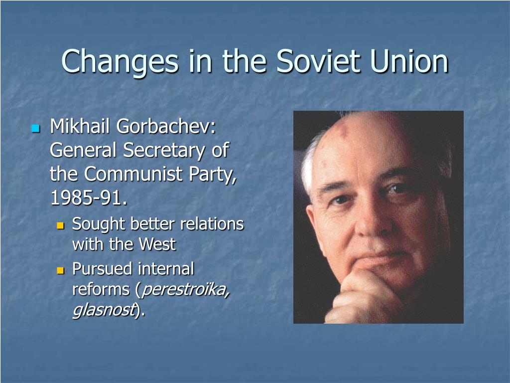 Changes in the Soviet Union • Mikhail Gorbachev: General Secretary of the Communist Party, 1985-91. • Sought better relations with the West • Pursued internal reforms (perestroїka,glasnost).