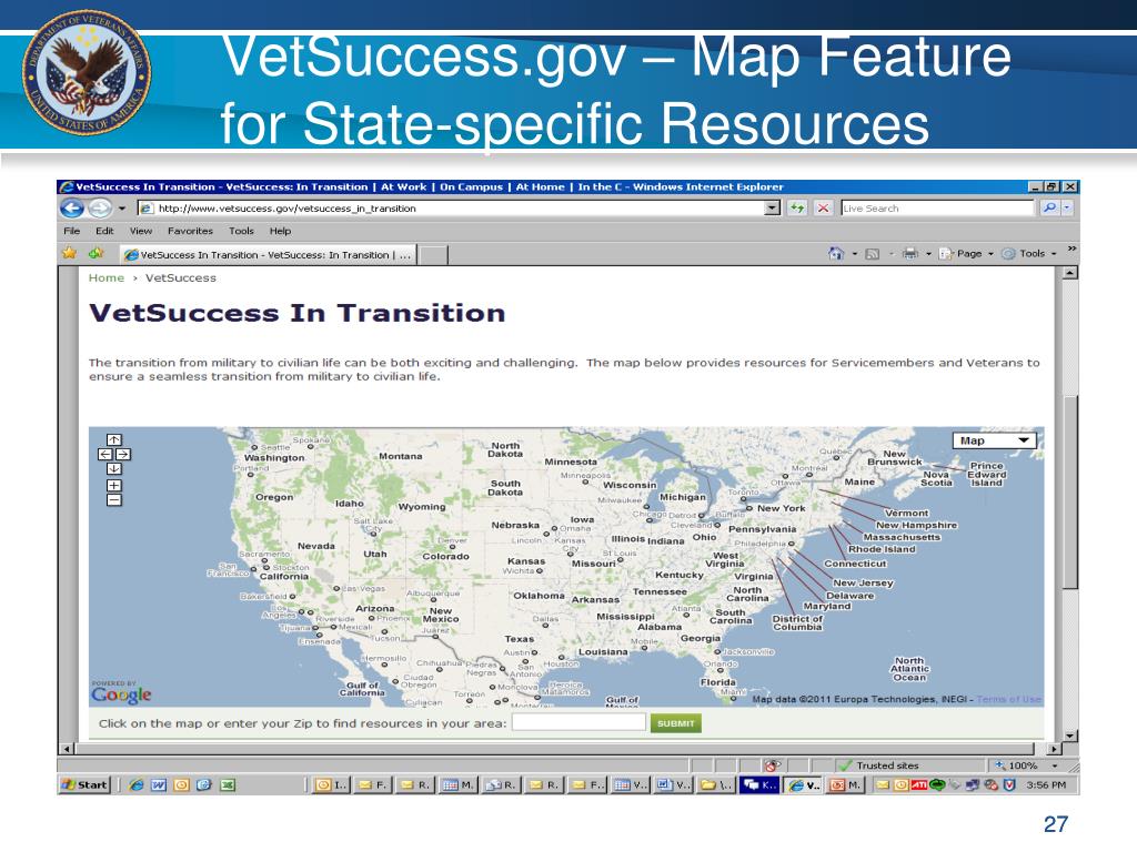 Recent VetSuccess.gov Enhancements VetSuccess.gov Enhancements State-specific resources searchable through map feature Military Skills Translator Interviewing skills tips Job hunting tips VetSuccess news Resume development tool Theme pages VetSuccess on Campus, At Home, In the Community, In Transition, At Work, and For the Veteran’s Family 23