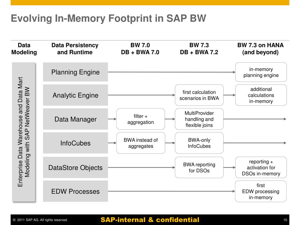 Planning Engine Evolving In-Memory Footprint in SAP BWOverview Data Modeling Data Persistency and Runtime BW 7.0 DB + BWA 7.0 BW 7.3 DB + BWA 7.2 BW 7.3 on HANA (and beyond) Enterprise Data Warehouse and Data Mart Modeling with SAP NetWeaver BW in-memory planning engine Analytic Engine first calculation scenarios in BWA additional calculations in-memory Data Manager filter + aggregation MultiProvider handling and flexible joins InfoCubes BWA instead of aggregates BWA-only InfoCubes DataStore Objects BWA reporting for DSOs reporting + activation for DSOs in-memory EDW Processes first EDW processing in-memory