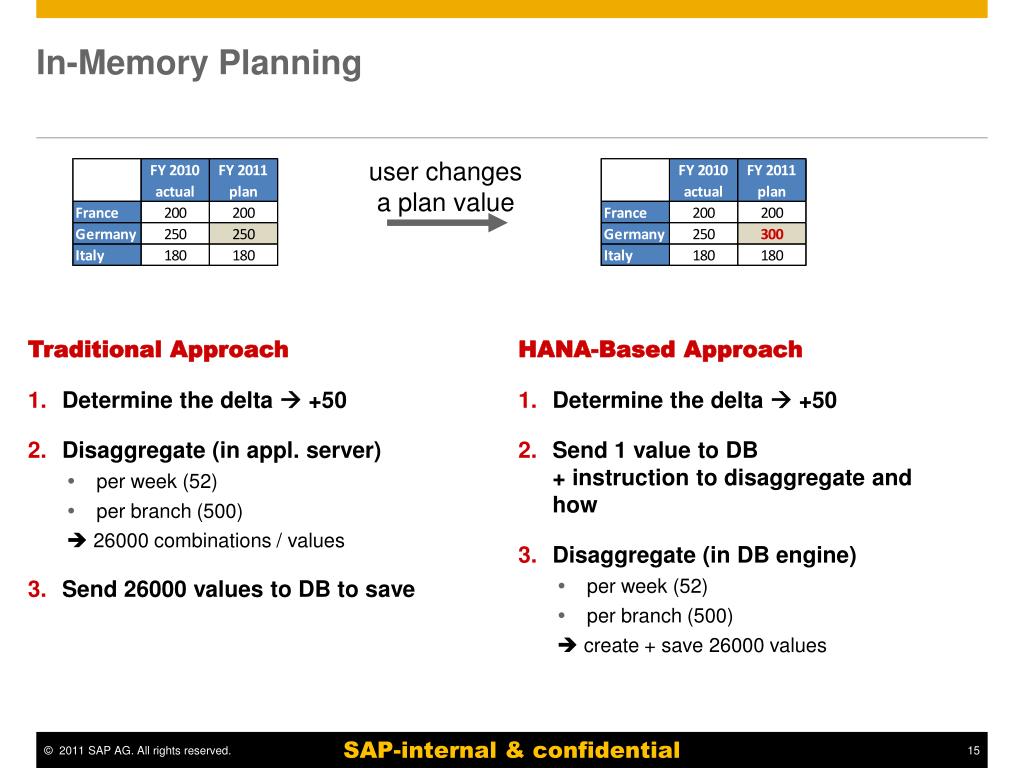 Traditional Approach Determine the delta +50 Disaggregate (in appl. server) per week (52) per branch (500) 26000 combinations / values Send 26000 values to DB to save HANA-Based Approach Determine the delta +50 Send 1 value to DB + instruction to disaggregate and how Disaggregate (in DB engine) per week (52) per branch (500) create + save 26000 values user changes a plan value In-Memory PlanningSimple Disaggregation Example
