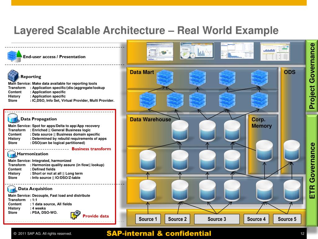 Layered Scalable Architecture – Real World Example Provide data End-user access / Presentation Project Governance Reporting Data Mart ODS Harmonization Data Propagation Main Service : Make data available for reporting tools Transform : Application specific/(dis-)aggregate/lookup Content : Application specific History : Application specific Store : IC,DSO, Info Set, Virtual Provider, Multi Provider. Data Acquisition Data Warehouse Corp. Memory ETR Governance Main Service : Spot for apps/Delta to app/App recovery Transform : Enriched || General Business logic Content : Data source || Business domain specific History : Determined by rebuild requirements of apps Store : DSO(can be logical partitioned) Business transform Main Service : Integrated, harmonized Transform : Harmonize quality assure (in flow|| lookup) Content : Defined fields History : Short or not at all || Long term Store : Info source || IO/DSO/Z-table Main Service : Decouple, Fast load and distribute Transform : 1:1 Content : 1 data source, All fields History : 4 weeks Store : PSA, DSO-WO. Source 1 Source 2 Source 3 Source 4 Source 5