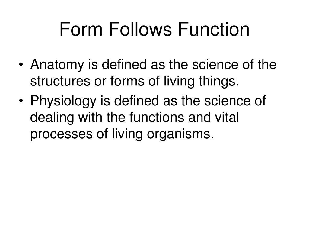 Form Follows Function • Anatomy is defined as the science of the structures or forms of living things. • Physiology is defined as the science of dealing with the functions and vital processes of living organisms.