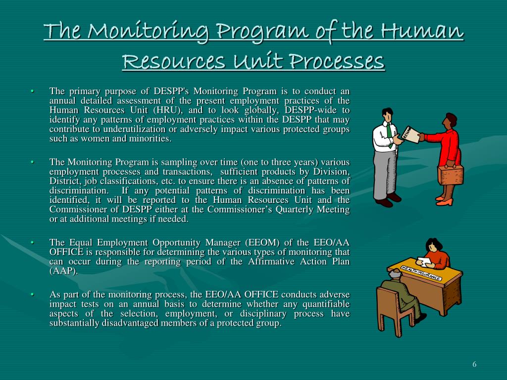 The Monitoring Program of the Human Resources Unit Processes • The primary purpose of DESPP's Monitoring Program is to conduct an annual detailed assessment of the present employment practices of the Human Resources Unit (HRU), and to look globally, DESPP-wide to identify any patterns of employment practices within the DESPP that may contribute to underutilization or adversely impact various protected groups such as women and minorities. • The Monitoring Program is sampling over time (one to three years) various employment processes and transactions, sufficient products by Division, District, job classifications, etc. to ensure there is an absence of patterns of discrimination. If any potential patterns of discrimination has been identified, it will be reported to the Human Resources Unit and the Commissioner of DESPP either at the Commissioner’s Quarterly Meeting or at additional meetings if needed. • The Equal Employment Opportunity Manager (EEOM) of the EEO/AA OFFICE is responsible for determining the various types of monitoring that can occur during the reporting period of the Affirmative Action Plan (AAP). • As part of the monitoring process, the EEO/AA OFFICE conducts adverse impact tests on an annual basis to determine whether any quantifiable aspects of the selection, employment, or disciplinary process have substantially disadvantaged members of a protected group.