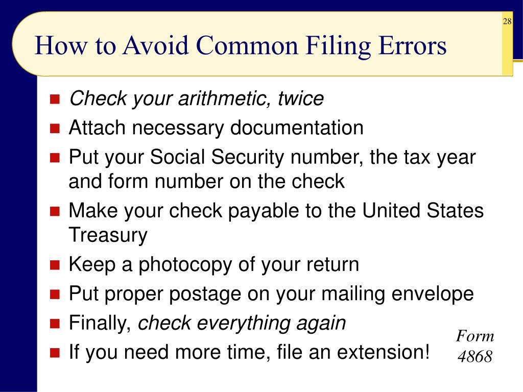 How to Avoid Common Filing Errors • Check your arithmetic, twice • Attach necessary documentation • Put your Social Security number, the tax year and form number on the check • Make your check payable to the United States Treasury • Keep a photocopy of your return • Put proper postage on your mailing envelope • Finally, check everything again • If you need more time, file an extension! Form 4868