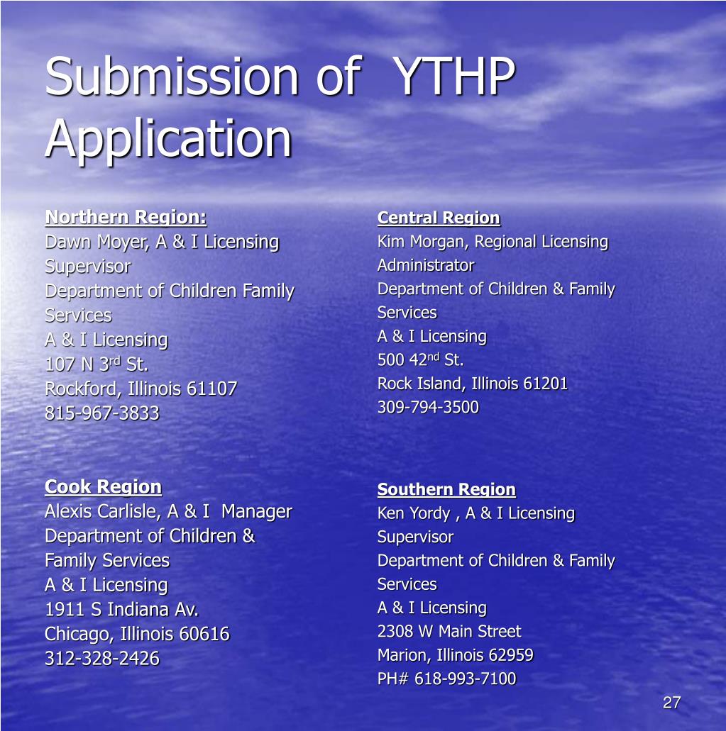 Northern Region: Dawn Moyer, A & I Licensing Supervisor Department of Children Family Services A & I Licensing 107 N 3rd St. Rockford, Illinois 61107 815-967-3833 Cook Region Alexis Carlisle, A & I Manager Department of Children & Family Services A & I Licensing 1911 S Indiana Av. Chicago, Illinois 60616 312-328-2426 Central Region Kim Morgan, Regional Licensing Administrator Department of Children & Family Services A & I Licensing 500 42nd St. Rock Island, Illinois 61201 309-794-3500 Southern Region Ken Yordy , A & I Licensing Supervisor Department of Children & Family Services A & I Licensing 2308 W Main Street Marion, Illinois 62959 PH# 618-993-7100 Submission of YTHP Application