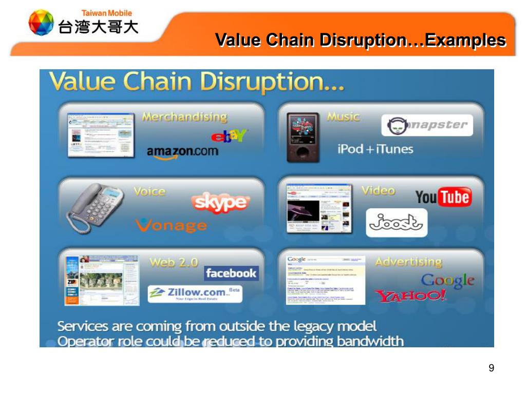 Threat and Challenge on Communications Industry Ebay/Paypal Communications Industry Supply Chain Business Model OPEX Marketing Service Payment Service CRM Service Network Connectivity Voice/Messaging Media & Entertainment End User and User Equipment Skype Apple WiFi Mesh/ WiMax MySpace/QQ