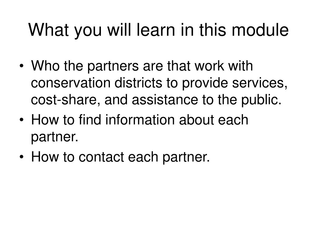 What you will learn in this module • Who the partners are that work with conservation districts to provide services, cost-share, and assistance to the public. • How to find information about each partner. • How to contact each partner.