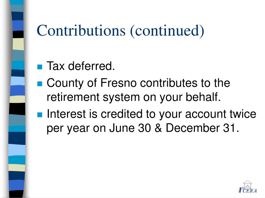 Contributions (continued) • Tax deferred. • County of Fresno contributes to the retirement system on your behalf. • Interest is credited to your account twice per year on June 30 & December 31.