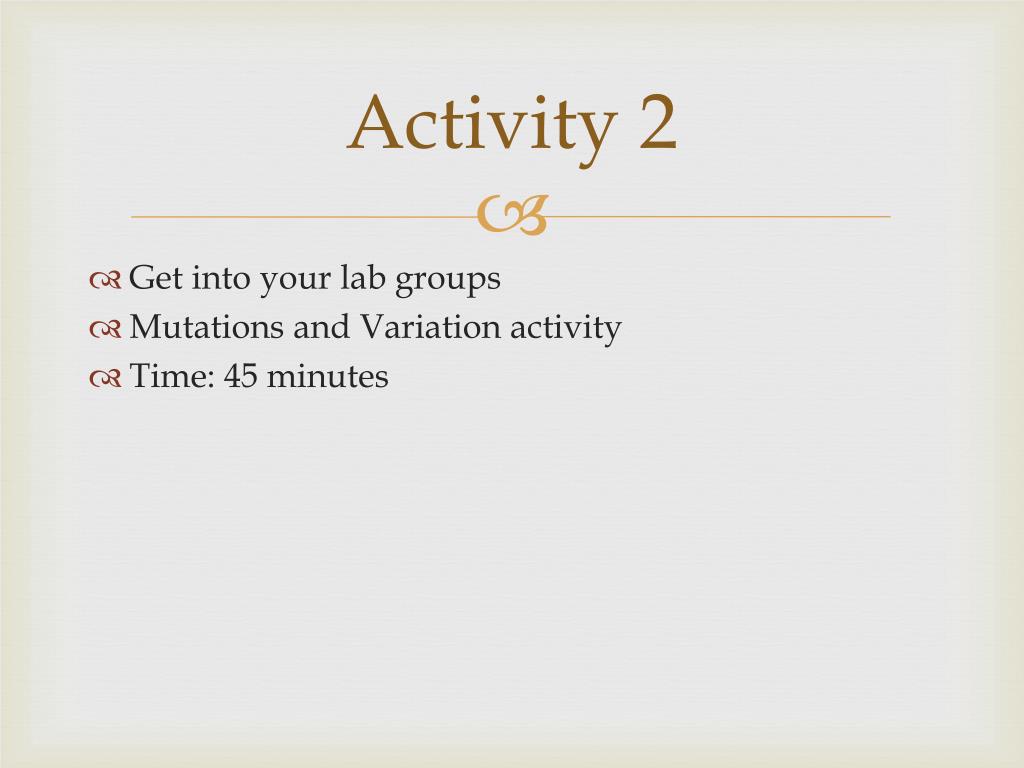 Activity 2 • Get into your lab groups • Mutations and Variation activity • Time: 45 minutes