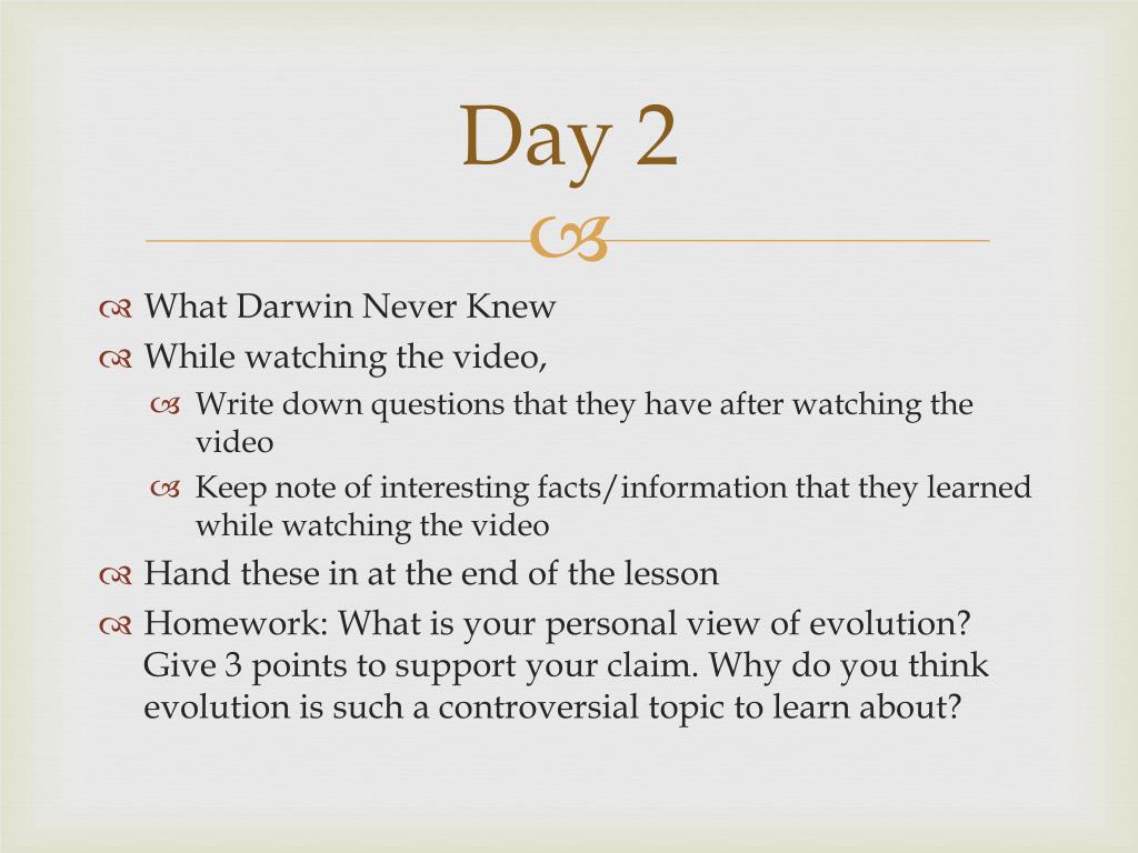 Day 2 • What Darwin Never Knew • While watching the video, • Write down questions that they have after watching the video • Keep note of interesting facts/information that they learned while watching the video • Hand these in at the end of the lesson • Homework: What is your personal view of evolution? Give 3 points to support your claim. Why do you think evolution is such a controversial topic to learn about?