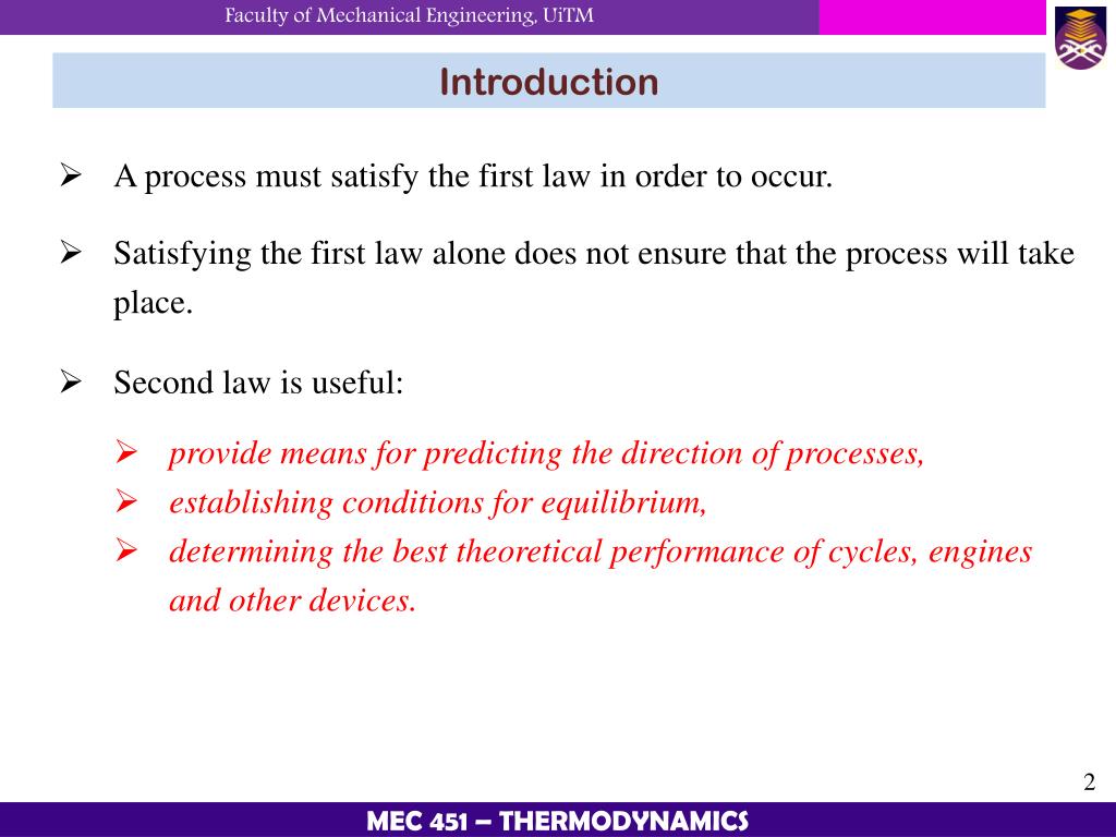 Faculty of Mechanical Engineering, UiTM Introduction • A process must satisfy the first law in order to occur. • Satisfying the first law alone does not ensure that the process will take place. • Second law is useful: • provide means for predicting the direction of processes, • establishing conditions for equilibrium, • determining the best theoretical performance of cycles, engines and other devices. MEC 451 – THERMODYNAMICS