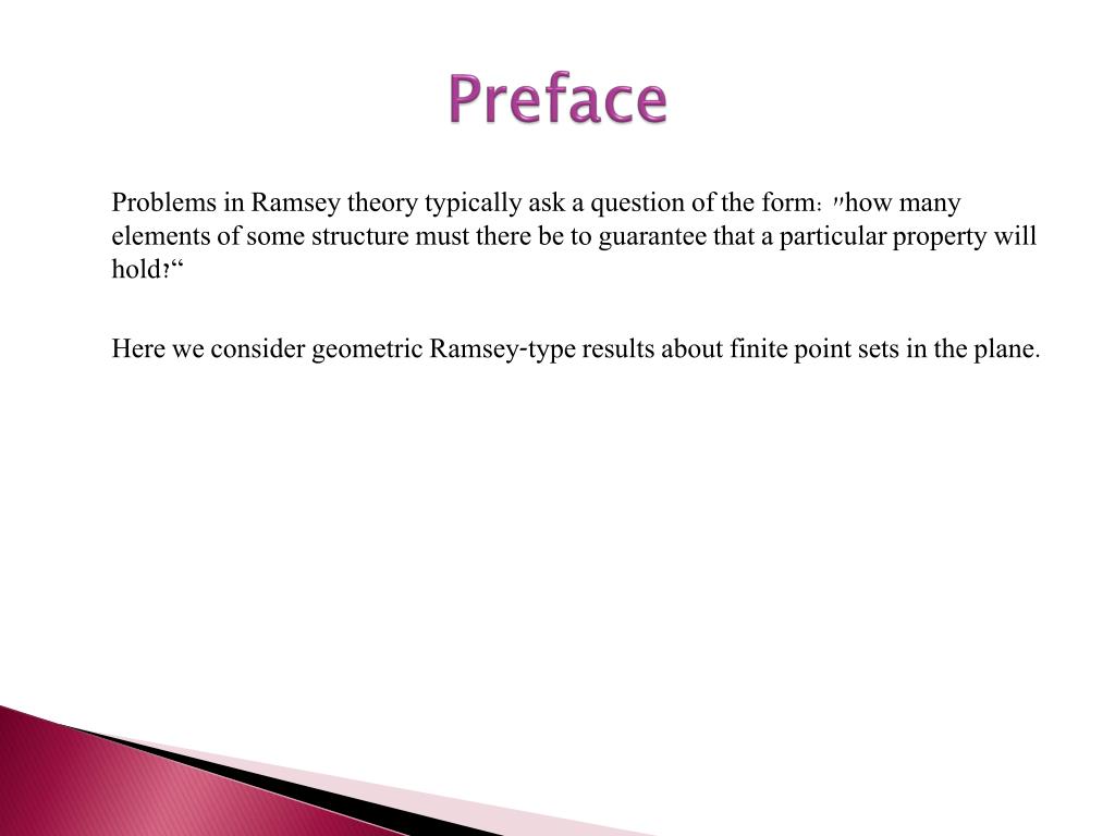 Convex Independent Subsets. Preface. Problems in Ramsey theory typically ask a question of the form: "how many elements of some structure must there be to guarantee that a particular property will hold?“ Here we consider geometric Ramsey-type results about finite point sets in the plane.