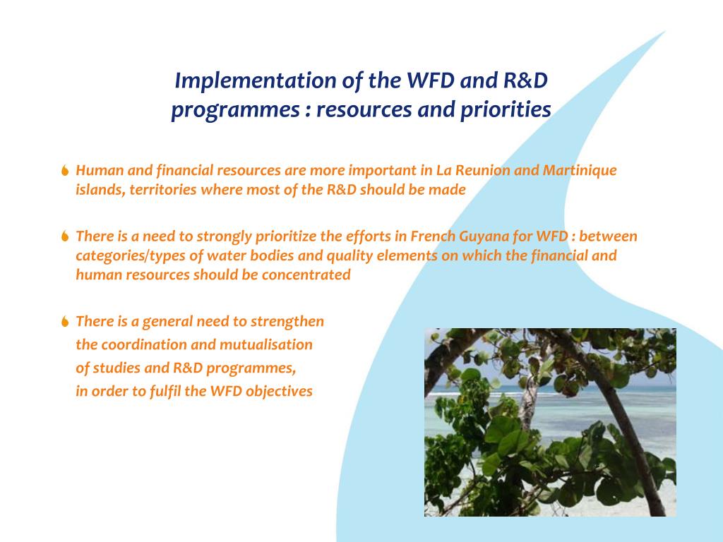 Implementation of the WFD and R&Dprogrammes : resources and priorities Human and financial resources are more important in La Reunion and Martinique islands, territories where most of the R&D should be made There is a need to strongly prioritize the efforts in French Guyana for WFD : between categories/types of water bodies and quality elements on which the financial and human resources should be concentrated There is a general need to strengthen the coordination and mutualisation of studies and R&D programmes, in order to fulfil the WFD objectives