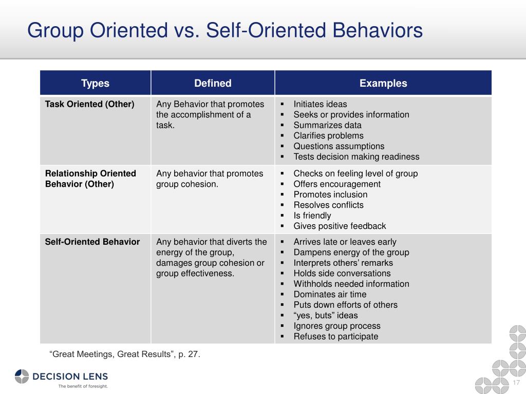 Group Oriented vs. Self-Oriented Behaviors “Great Meetings, Great Results”, p. 27.