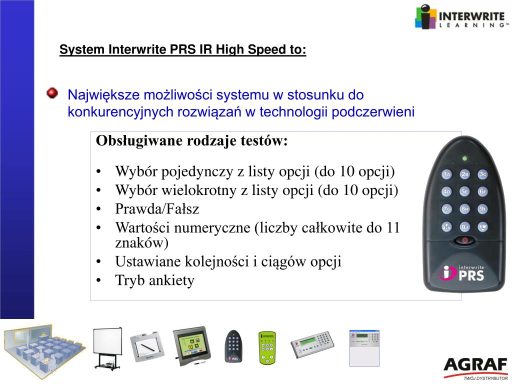 Kolejnym elementem systemu jest Interwrite PRS Interwrite PRS jest połączeniem narzędzi, umożliwiających: rzeczywistą, interaktywną współpracę nauczyciela z uczniami obiektywną ocenę rezultatów samego procesu nauczania