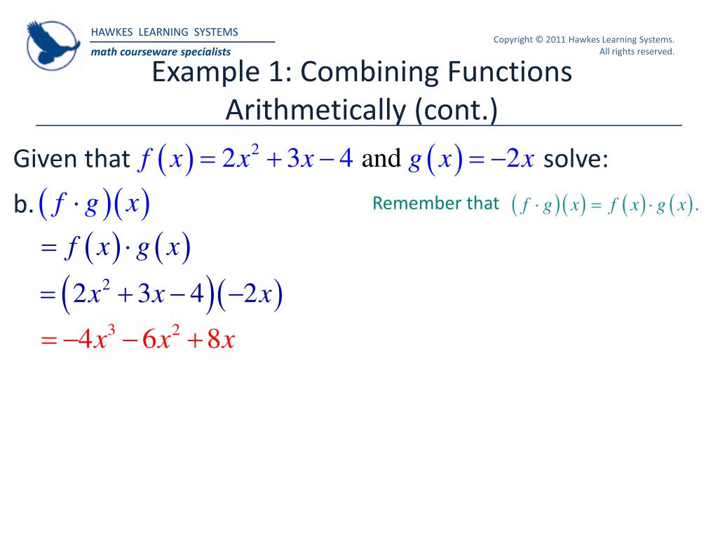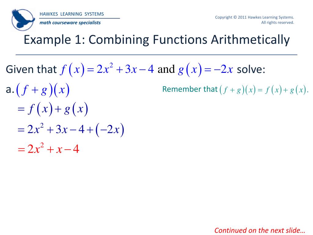 Example 1: Combining Functions Arithmetically Given that solve: a. Remember that Continued on the next slide…