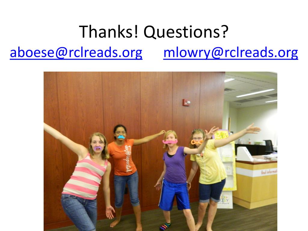 Challenges • Teen tech open lab – drop in versus drop off • Cutting edge tech sometimes FAILS • Free software goes away (RIP: aviary.com) • Schools block free software • Libraries block downloads • Vendor issues: bugs are bugs • Staffing changes