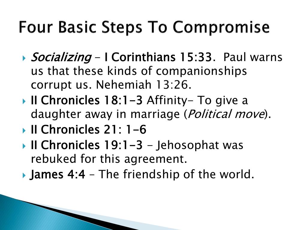 Four Basic Steps To Compromise • Socializing - I Corinthians 15:33. Paul warns us that these kinds of companionships corrupt us. Nehemiah 13:26. • II Chronicles 18:1-3 Affinity- To give a daughter away in marriage (Political move). • II Chronicles 21: 1-6 • II Chronicles 19:1-3 - Jehosophat was rebuked for this agreement. • James 4:4 – The friendship of the world.