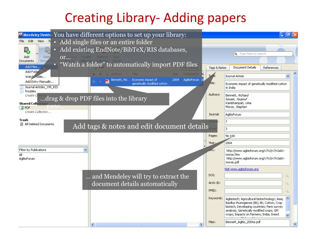Creating Library- Adding papers • You have different options to set up your library: • Add single files or an entire folder • Add existing EndNote/BibTeX/RIS databases, or… • “Watch a folder” to automatically import PDF files …drag & drop PDF files into the library pane… Add tags & notes and edit document details … and Mendeley will try to extract the document details automatically