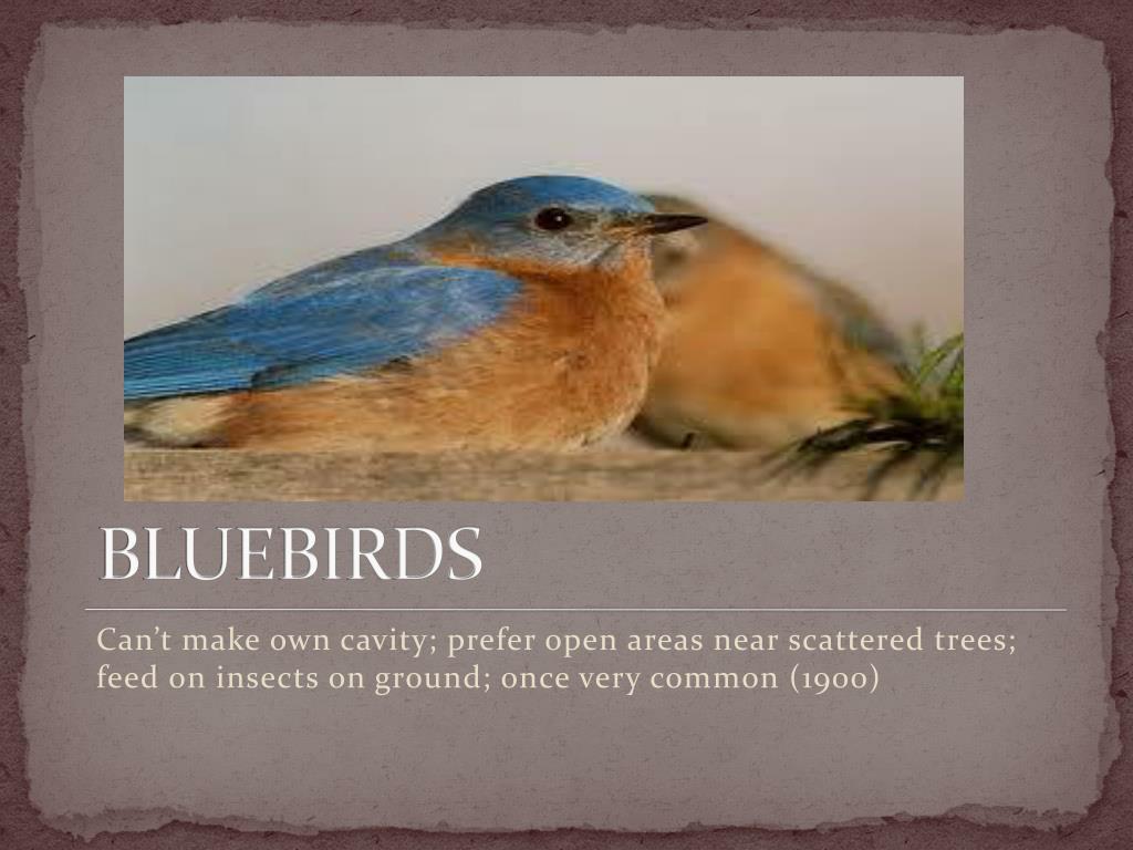 BLUEBIRDS Can’t make own cavity; prefer open areas near scattered trees; feed on insects on ground; once very common (1900)