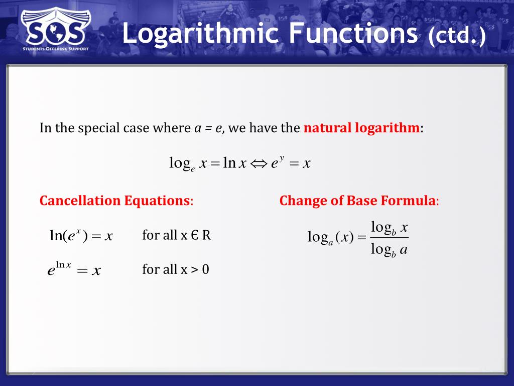 Logarithmic Functions (ctd.) In the special case where a = e, we have the natural logarithm: Cancellation Equations: for all x Є R for all x > 0 Change of Base Formula: