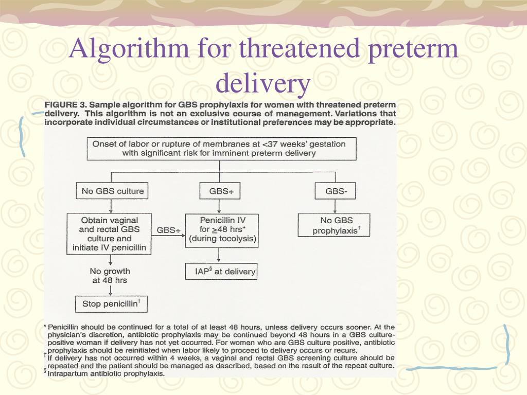Differences cont • Recommendations against routine intrapartum antibiotic prophylaxis for GBS-colonized women undergoing planned cesarean deliveries who have not begun labor or had ROM. • A suggested algorithm for management of patients with threatened preterm delivery . • An updated algorithm for management of newborns exposed to intrapartum antibiotic prophylaxis. MMWR,51(RR-11);1-23.2002.