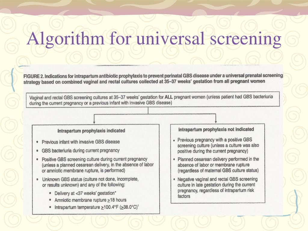 Background • In the 1970’s GBS emerged as the leading cause of neonatal morbidity and mortality in the USA. • In the early 1980’s clinical trials showed that IV antibiotics given during labor to “at risk” women could prevent early onset disease in the newborns.