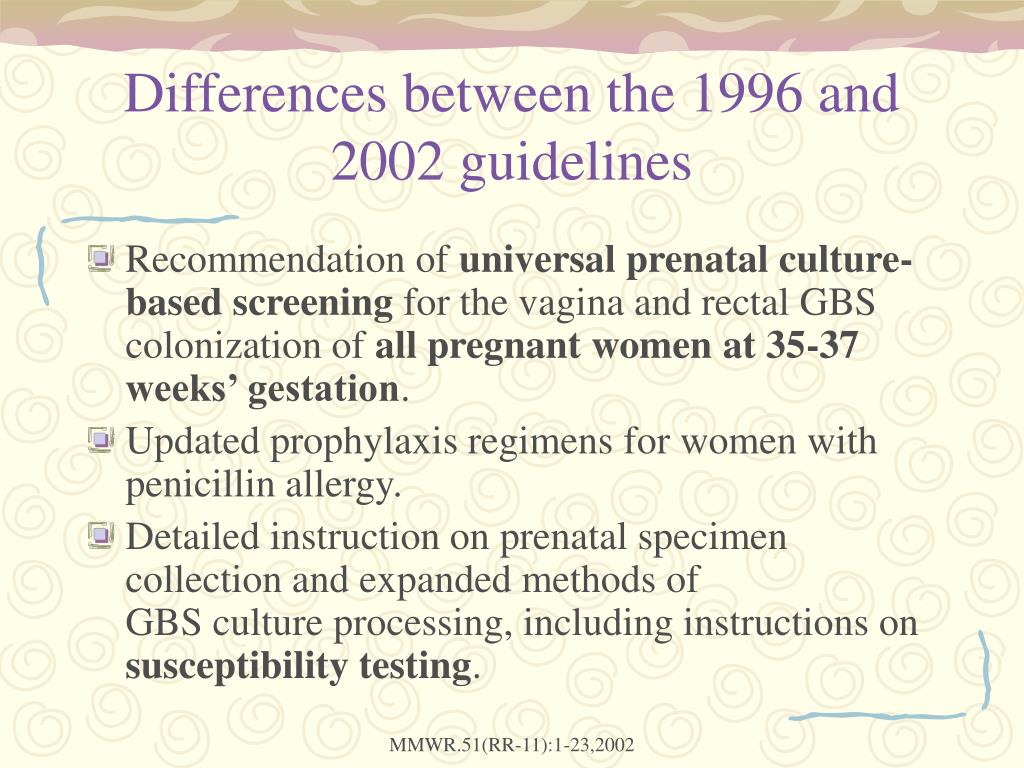 Differences between the 1996 and 2002 guidelines • Recommendation of universal prenatal culture-based screening for the vagina and rectal GBS colonization of all pregnant women at 35-37 weeks’ gestation. • Updated prophylaxis regimens for women with penicillin allergy. • Detailed instruction on prenatal specimen collection and expanded methods of GBS culture processing, including instructions on susceptibility testing. MMWR.51(RR-11):1-23,2002