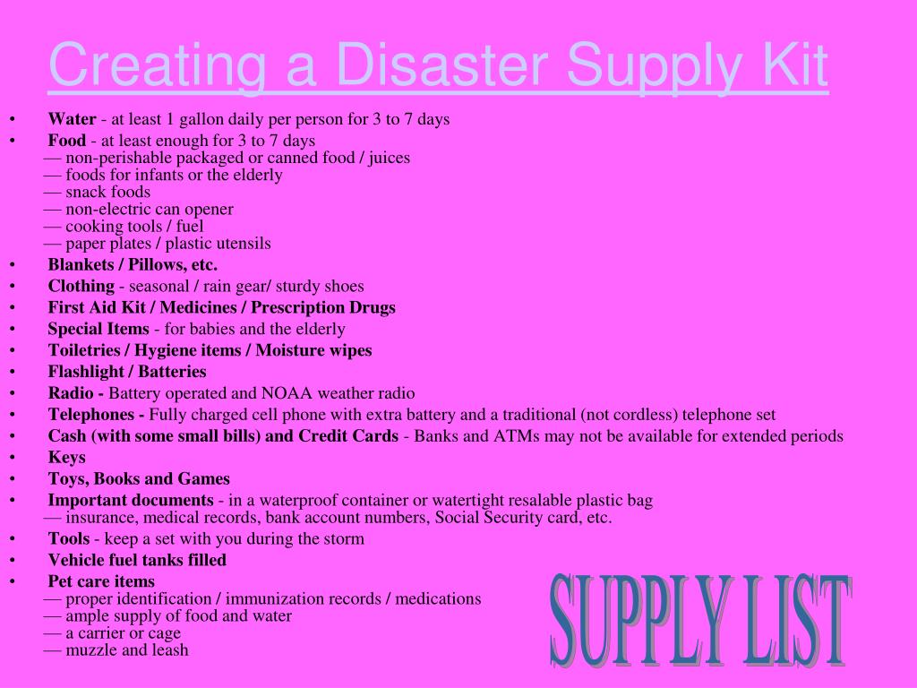 Creating a Disaster Supply Kit • Water - at least 1 gallon daily per person for 3 to 7 days • Food - at least enough for 3 to 7 days— non-perishable packaged or canned food / juices— foods for infants or the elderly— snack foods— non-electric can opener— cooking tools / fuel— paper plates / plastic utensils • Blankets / Pillows, etc. • Clothing - seasonal / rain gear/ sturdy shoes • First Aid Kit / Medicines / Prescription Drugs • Special Items - for babies and the elderly • Toiletries / Hygiene items / Moisture wipes • Flashlight / Batteries • Radio - Battery operated and NOAA weather radio • Telephones - Fully charged cell phone with extra battery and a traditional (not cordless) telephone set • Cash (with some small bills) and Credit Cards - Banks and ATMs may not be available for extended periods • Keys • Toys, Books and Games • Important documents - in a waterproof container or watertight resalable plastic bag— insurance, medical records, bank account numbers, Social Security card, etc. • Tools - keep a set with you during the storm • Vehicle fuel tanks filled • Pet care items— proper identification / immunization records / medications— ample supply of food and water— a carrier or cage— muzzle and leash SUPPLY LIST