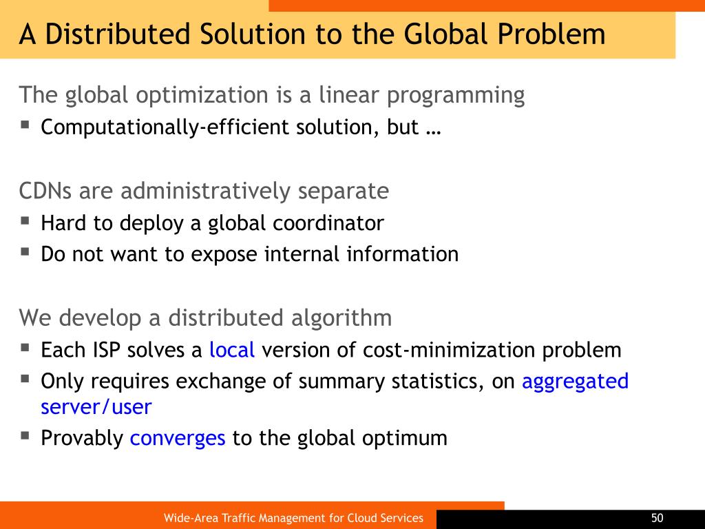 A Distributed Solution to the Global Problem • The global optimization is a linear programming • Computationally-efficient solution, but … • CDNs are administratively separate • Hard to deploy a global coordinator • Do not want to expose internal information • We develop a distributed algorithm • Each ISP solves a local version of cost-minimization problem • Only requires exchange of summary statistics, on aggregated server/user • Provably converges to the global optimum Wide-Area Traffic Management for Cloud Services