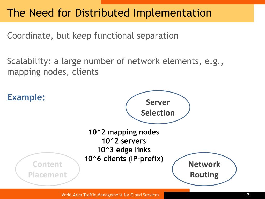 The Need for Distributed Implementation • Coordinate, but keep functional separation • Scalability: a large number of network elements, e.g., mapping nodes, clients • Example: Server Selection 10^2 mapping nodes 10^2 servers 10^3 edge links 10^6 clients (IP-prefix) Content Placement Network Routing Wide-Area Traffic Management for Cloud Services
