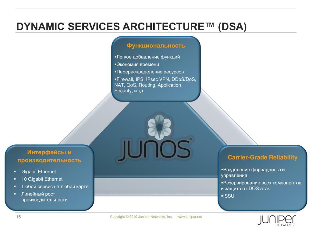 Dynamic Services Architecture™ (DSA) • Функциональность • Легкое добавление функций • Экономия времени • Перераспределение ресурсов • Firewall, IPS, IPsec VPN, DDoS/DoS, NAT, QoS, Routing, Application Security, и тд • Интерфейсы и производительность • Gigabit Ethernet • 10 Gigabit Ethernet • Любой сервис на любой карте • Линейный рост производительности • Carrier-Grade Reliability • Разделение форвардинга и управления • Резервирование всех компонентов и защита от DOS атак • ISSU