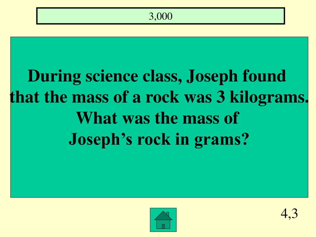 4,3 3,000 During science class, Joseph found that the mass of a rock was 3 kilograms. What was the mass of Joseph’s rock in grams?