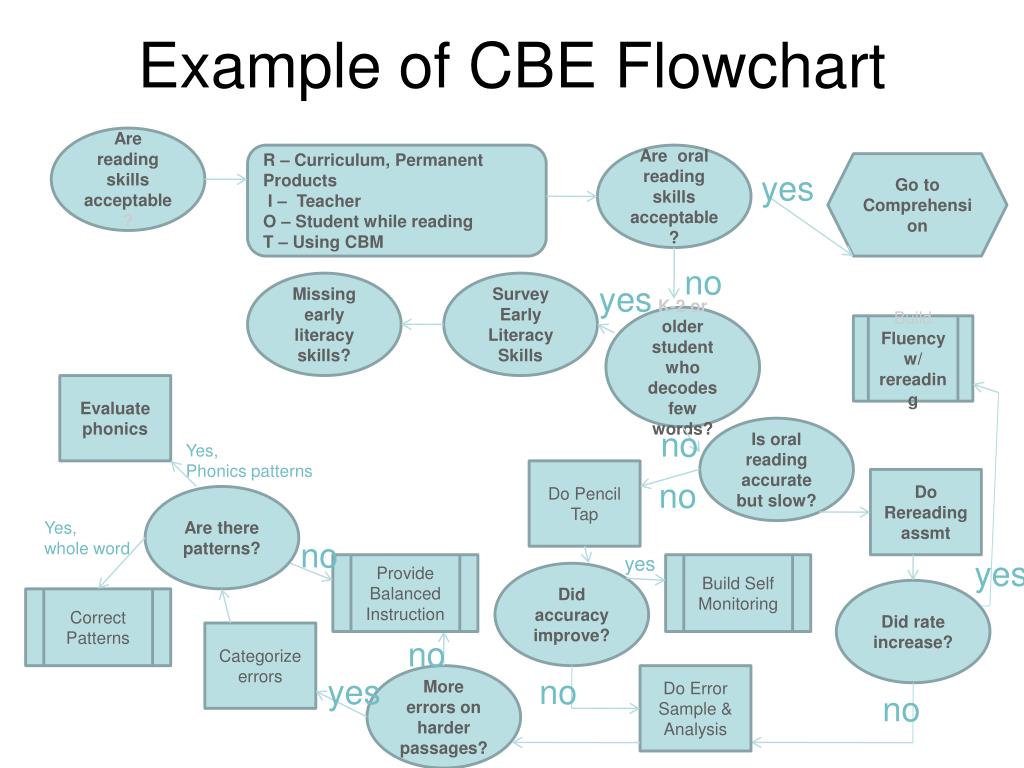 Example of CBE Flowchart Are reading skills acceptable? R – Curriculum, Permanent Products I – Teacher O – Student while reading T – Using CBM Are oral reading skills acceptable? Go to Comprehension yes no Missing early literacy skills? Survey Early Literacy Skills yes K-2 or older student who decodes few words? Build Fluency w/ rereading Evaluate phonics no Is oral reading accurate but slow? Yes, Phonics patterns Do Pencil Tap no Do Rereading assmt Are there patterns? Yes, whole word no yes yes Provide Balanced Instruction Build Self Monitoring Did accuracy improve? Did rate increase? Correct Patterns Categorize errors no yes More errors on harder passages? no Do Error Sample & Analysis no