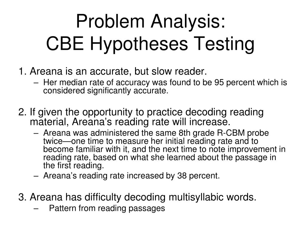 Problem Analysis:CBE Hypotheses Testing 1. Areana is an accurate, but slow reader. • Her median rate of accuracy was found to be 95 percent which is considered significantly accurate. 2. If given the opportunity to practice decoding reading material, Areana’s reading rate will increase. • Areana was administered the same 8th grade R-CBM probe twice—one time to measure her initial reading rate and to become familiar with it, and the next time to note improvement in reading rate, based on what she learned about the passage in the first reading. • Areana’s reading rate increased by 38 percent. 3. Areana has difficulty decoding multisyllabic words. • Pattern from reading passages