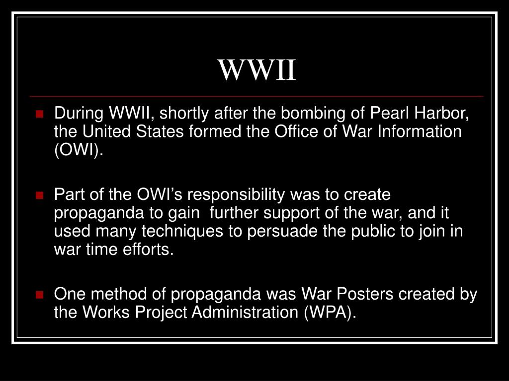 WWII • During WWII, shortly after the bombing of Pearl Harbor, the United States formed the Office of War Information (OWI). • Part of the OWI’s responsibility was to create propaganda to gain further support of the war, and it used many techniques to persuade the public to join in war time efforts. • One method of propaganda was War Posters created by the Works Project Administration (WPA).