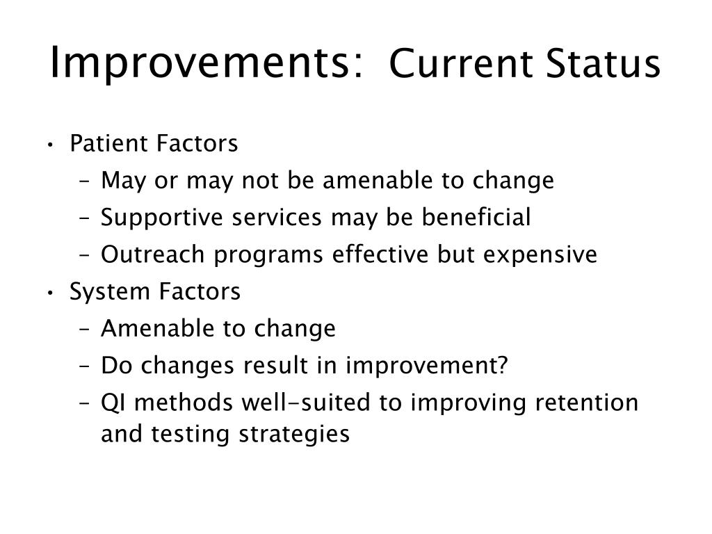 Improvements: CurrentStatus • Patient Factors • May or may not be amenable to change • Supportive services may be beneficial • Outreach programs effective but expensive • System Factors • Amenable to change • Do changes result in improvement? • QI methods well-suited to improving retention and testing strategies