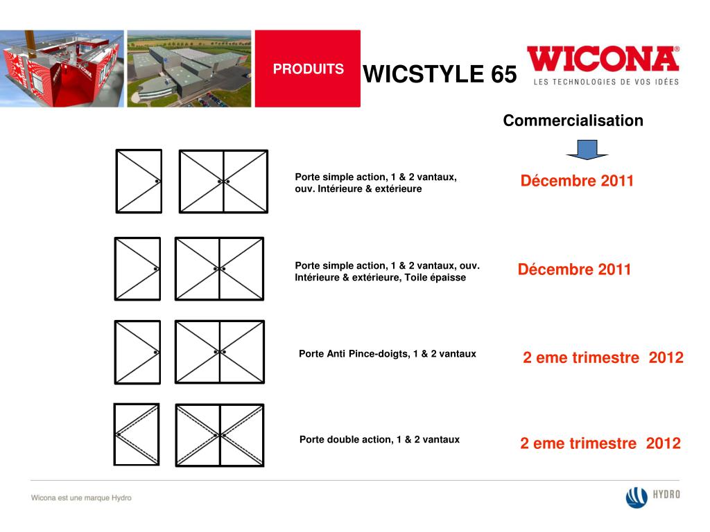 PRODUITS. PRODUITS. WICSTYLE 65. Commercialisation. Porte simple action, 1 & 2 vantaux, ouv. Intérieure & extérieure. Décembre 2011. Porte simple action, 1 & 2 vantaux, ouv. Intérieure & extérieure, Toile épaisse. Décembre 2011. Porte Anti Pince-doigts, 1 & 2 vantaux.