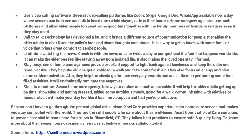 Use video calling software: Several video-calling platforms like Zoom, Skype, Google Duo, WhatsApp available now a day where seniors can both see and talk to loved ones while staying safe in their homes. Home caregiver agencies use such platforms and allow older people to spend some good time together with the family members or friends or relatives even if they stay apart. • Call to talk: Technology has developed a lot, and it brings a different source of communication for people. It enables the older adults to chat & see the caller's face and share thoughts and stories. It is a way to get in touch with some familiar voice that brings great comfort to senior people. • Limit time watching the news: Check in with the news once or twice a day to comprehend the fact that happens worldwide. It can make the elder one feel like staying away from isolated life. It also makes the loved one stay informed. • Stay busy: senior home care agencies provide excellent support to fight back against loneliness and keep the older one remain active. They help the old one get outside for a walk and take some fresh air. They also focus on energy and plan some outdoor activities. Also, they help the clients go for their everyday errands and assist them in performing some fun-filled activities. It will undoubtedly ruminate the negatives. • Stick to a routine: Senior home care agency, follow your routine as much as possible. It will help the older adults getting up on time, showering and getting dressed, taking some nutritious meals, going for a walk, communicating with relatives or friends, etc. It will make your day feel like it has more purpose and that you're productive. Seniors don't have to go through the present global crisis alone. Xcel Care provides superior senior home care service and makes you stay connected with the world. They are the right people who care about their well-being. Apart from that, Xcel Care continues to provide essential in-home care for seniors in Bloomfield, CT. They follow best practices to ensure safe & quality living. To know more about their senior home care agency, services schedule a free consultation today! Source from: https://xcelhomecare.wordpress.com/