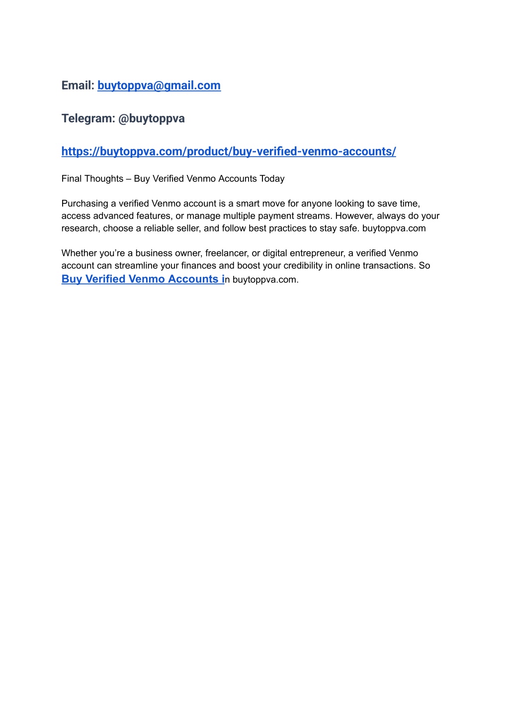 4. Email: buytoppva@gmail.com Telegram: @buytoppva https://buytoppva.com/product/buy-verified-venmo-accounts/ Final Thoughts – Buy Verified Venmo Accounts Today Purchasing a verified Venmo account is a smart move for anyone looking to save time, access advanced features, or manage multiple payment streams. However, always do your research, choose a reliable seller, and follow best practices to stay safe. buytoppva.com Whether you’re a business owner, freelancer, or digital entrepreneur, a verified Venmo account can streamline your finances and boost your credibility in online transactions. So Buy Verified Venmo Accounts in buytoppva.com.