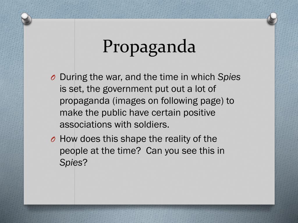 Propaganda • During the war, and the time in which Spies is set, the government put out a lot of propaganda (images on following page) to make the public have certain positive associations with soldiers. • How does this shape the reality of the people at the time? Can you see this in Spies?