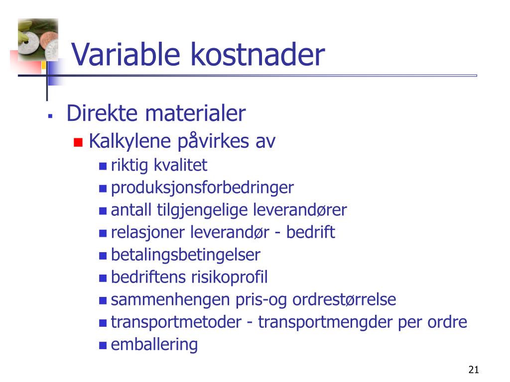 Variable kostnader • Direkte materialer • Kalkylene påvirkes av • riktig kvalitet • produksjonsforbedringer • antall tilgjengelige leverandører • relasjoner leverandør - bedrift • betalingsbetingelser • bedriftens risikoprofil • sammenhengen pris-og ordrestørrelse • transportmetoder - transportmengder per ordre • emballering