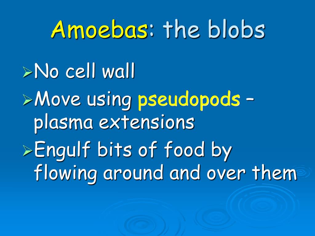 Amoebas: the blobs • No cell wall • Move using pseudopods – plasma extensions • Engulf bits of food by flowing around and over them