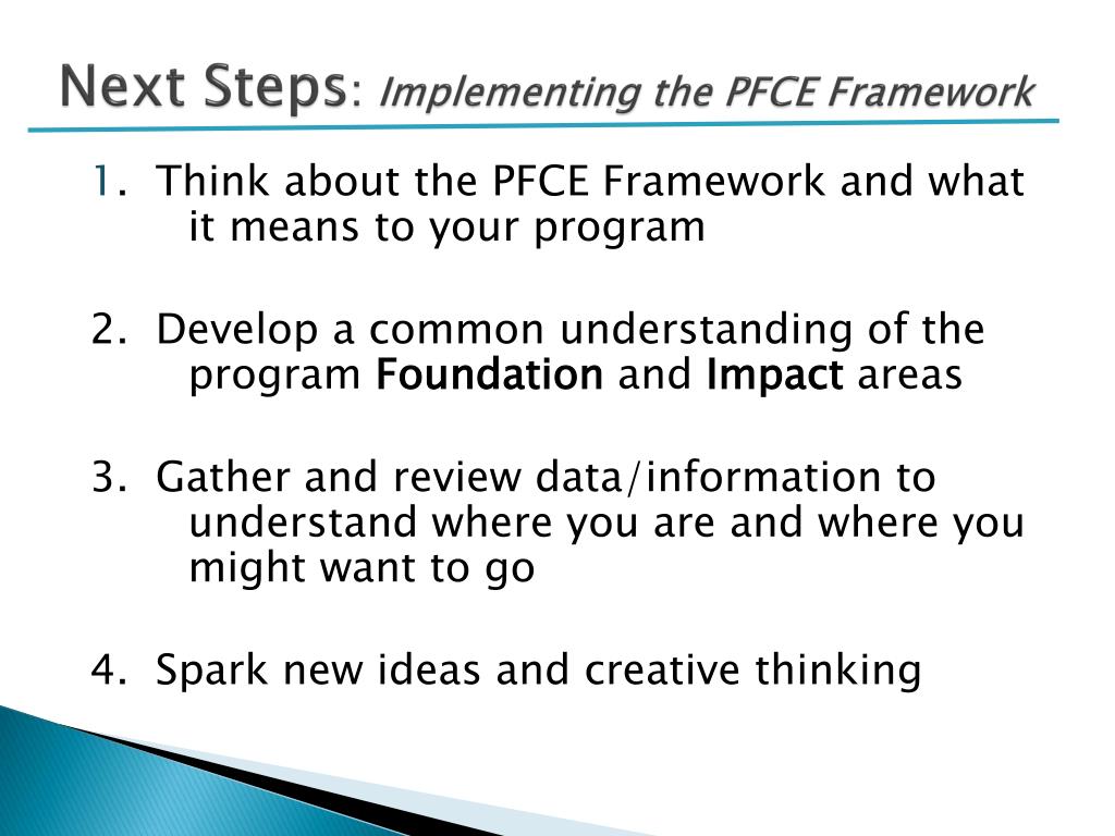 Next Steps: Implementing the PFCE Framework 1. Think about the PFCE Framework and what it means to your program 2. Develop a common understanding of the program Foundation and Impact areas 3. Gather and review data/information to understand where you are and where you might want to go 4. Spark new ideas and creative thinking
