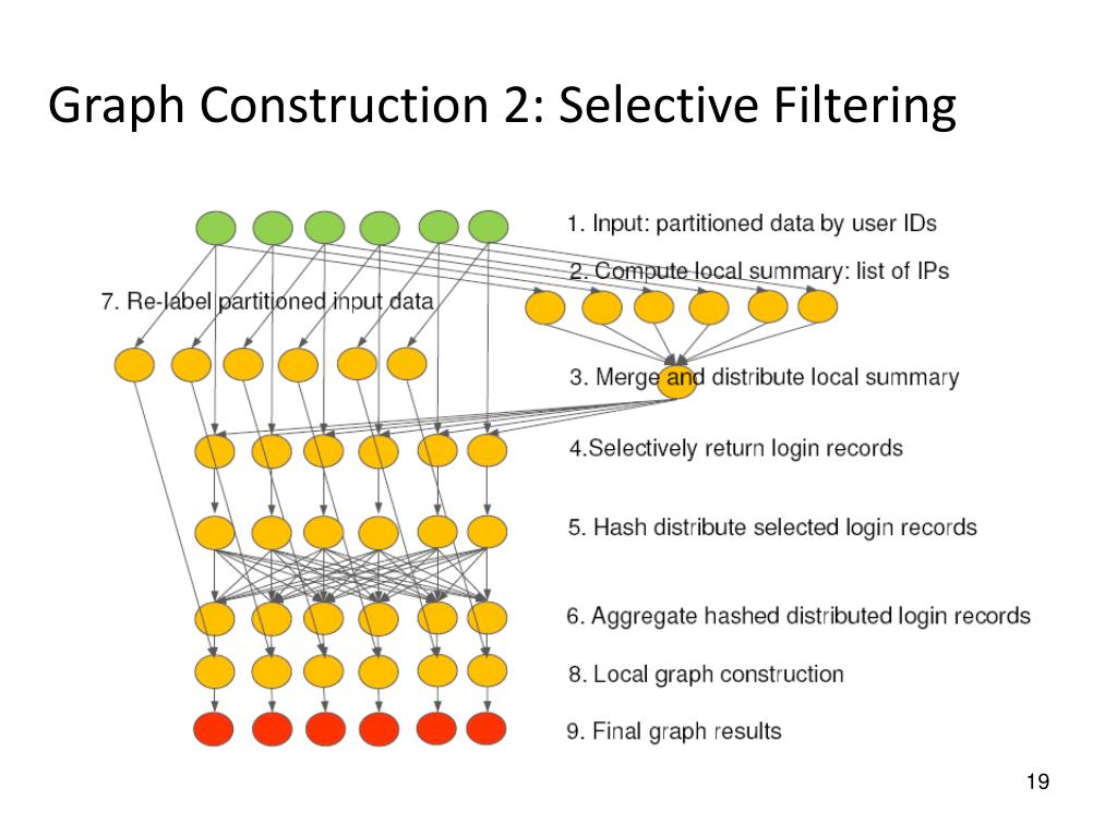 Graph Construction 1: Simple Data Parallelism • Potential Edges • Select ID group by IP (Map) • Generate potential edges (IDi, IDj, IPk) (Reduce) • Edge Weights • Select IP group by ID pair (Map) • Calculate edge weight (Reduce) • Problem • Weight 1 edge is two orders of magnitude more than others • Their computation/communication is unnecessary