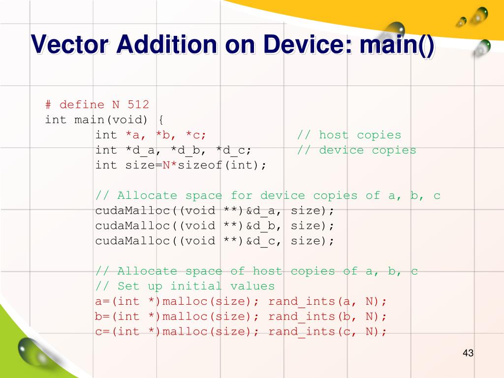 Vector Addition on Device: main() # define N 512 int main(void) { int*a, *b, *c;// host copies int *d_a, *d_b, *d_c; // device copies int size=N*sizeof(int); // Allocate space for device copies of a, b, c cudaMalloc((void **)&d_a, size); cudaMalloc((void **)&d_b, size); cudaMalloc((void **)&d_c, size); // Allocate space of host copies of a, b, c // Set up initial values a=(int *)malloc(size); rand_ints(a, N); b=(int *)malloc(size); rand_ints(b, N); c=(int *)malloc(size); rand_ints(c, N);