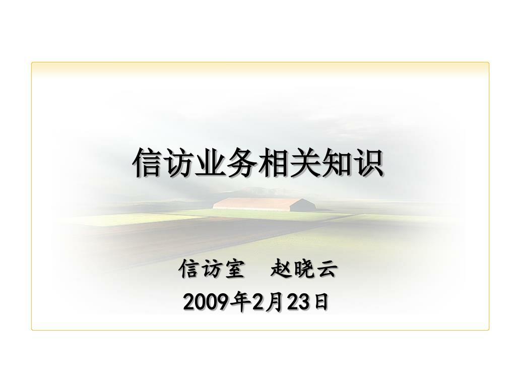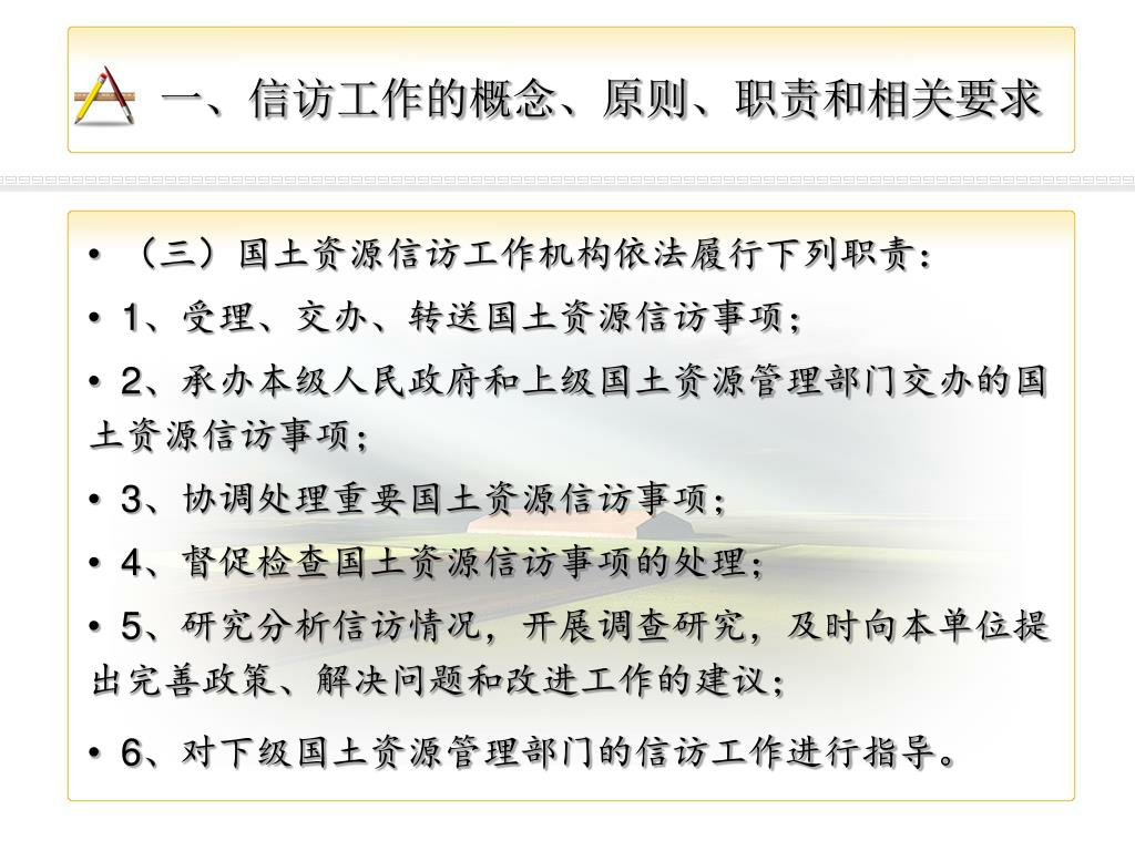 信访业务相关知识. 信访室 赵晓云 2009 年 2 月 23 日. 一、信访工作的概念、原则、职责和相关要求. (一)国土资源信访的概念 国土资源信访是指公民、法人或者其他组织采用书信、电子邮件、传真、电话、走访等形式,向国土资源管理部门反映情况,提出建议、意见或者投诉请求,依法由国土资源管理部门处理的活动。信访人是指上述规定形式,反映情况,提出建议,意见或者投诉请求的公民、法人或者其他组织。. 一、信访工作的概念、原则、职责和相关要求. (二)原则国土资源信访工作应当遵循下列原则: 1 、属地管理、分级负责,谁主管、谁负责; 2 、畅通信访渠道,方便信访人;