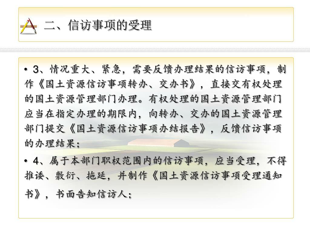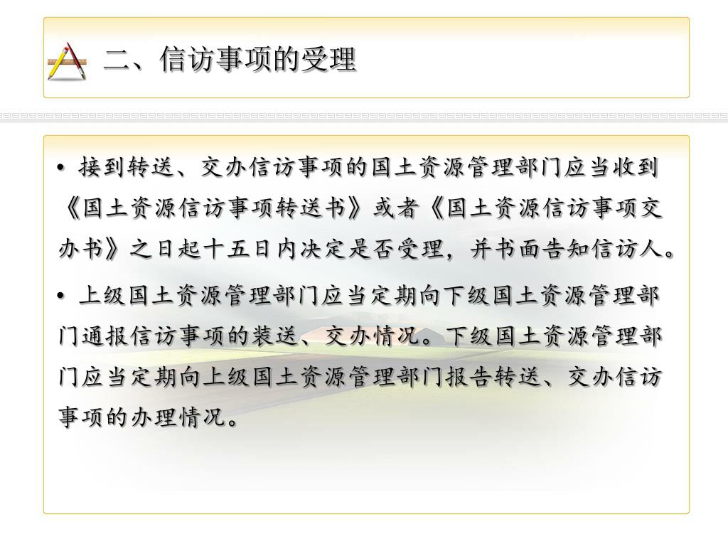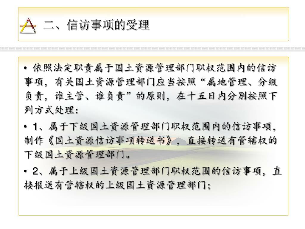 二、信访事项的受理 • 依照法定职责属于国土资源管理部门职权范围内的信访事项,有关国土资源管理部门应当按照“属地管理、分级负责,谁主管、谁负责”的原则,在十五日内分别按照下列方式处理: • 1、属于下级国土资源管理部门职权范围内的信访事项,制作《国土资源信访事项转送书》,直接转送有管辖权的下级国土资源管理部门。 • 2、属于上级国土资源管理部门职权范围的信访事项,直接报送有管辖权的上级国土资源管理部门;