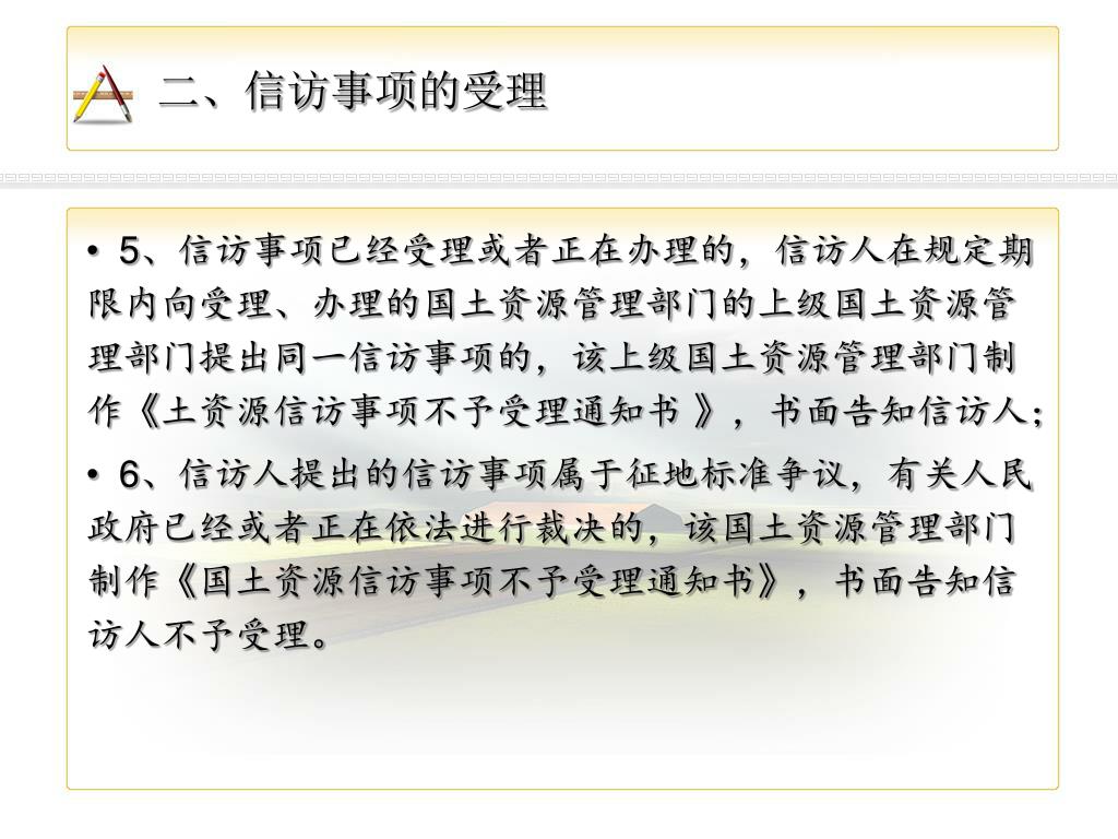 二、信访事项的受理 • 5、信访事项已经受理或者正在办理的,信访人在规定期限内向受理、办理的国土资源管理部门的上级国土资源管理部门提出同一信访事项的,该上级国土资源管理部门制作《土资源信访事项不予受理通知书 》,书面告知信访人; • 6、信访人提出的信访事项属于征地标准争议,有关人民政府已经或者正在依法进行裁决的,该国土资源管理部门制作《国土资源信访事项不予受理通知书》,书面告知信访人不予受理。