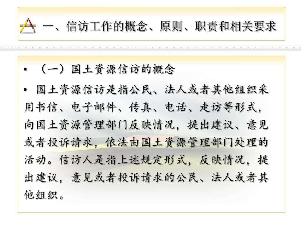 一、信访工作的概念、原则、职责和相关要求 • (一)国土资源信访的概念 • 国土资源信访是指公民、法人或者其他组织采用书信、电子邮件、传真、电话、走访等形式,向国土资源管理部门反映情况,提出建议、意见或者投诉请求,依法由国土资源管理部门处理的活动。信访人是指上述规定形式,反映情况,提出建议,意见或者投诉请求的公民、法人或者其他组织。